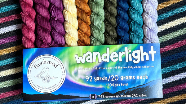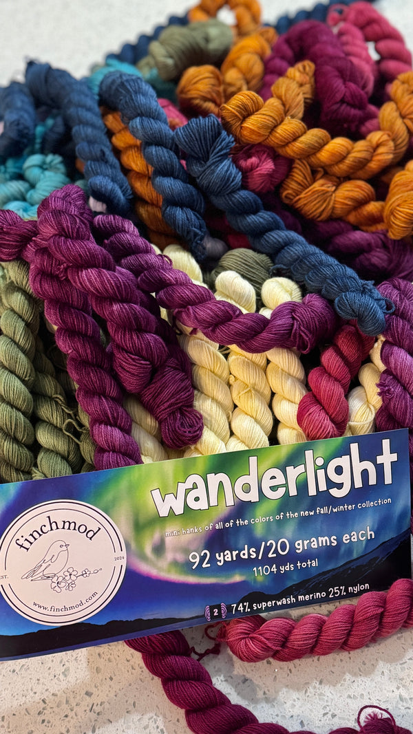 I always love seeing what colors are trending and what’s new on the runway, but what brings me the most joy is choosing the shades that really speak to me. As I put this palette together, each color started to tell its own part of the story, and soon the whole collection pictured a cozy cabin in the woods in my mind. I imagined curling up by the fire while cold night air settled outside, with the northern lights shimmering in the sky through the window. Every shade in wanderlight was chosen to capture that sense of warmth, comfort, and winter magic. It's the kind of feeling that makes you want to pick up your needles and stay a little longer in the moment.