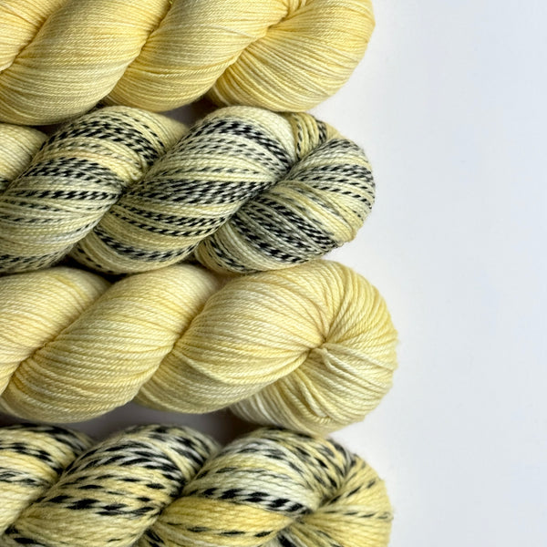 Please note: Due to the hand-dyeing techniques I use, each hank will be unique, even within the same batch, but all are dyed together to maintain consistency. Color intensity may also vary with fiber content. Yarns that are 100% superwash wool will appear more vibrant, while bases with nylon, silk, non-superwash wool, or cellulose fibers (like cotton or linen) will have a softer, more muted appearance.