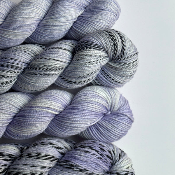 Please note: Due to the hand-dyeing techniques I use, each hank will be unique, even within the same batch, but all are dyed together to maintain consistency. Color intensity may also vary with fiber content. Yarns that are 100% superwash wool will appear more vibrant, while bases with nylon, silk, non-superwash wool, or cellulose fibers (like cotton or linen) will have a softer, more muted appearance.