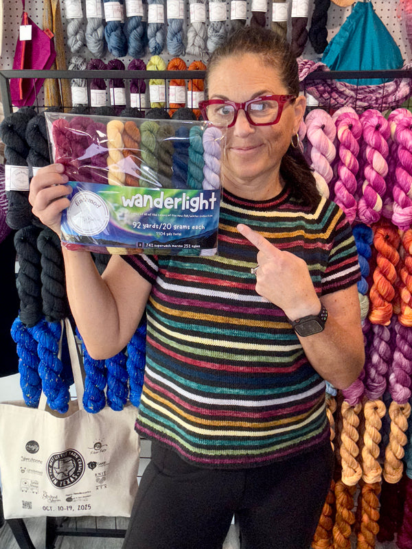 I always love seeing what colors are trending and what’s new on the runway, but what brings me the most joy is choosing the shades that really speak to me. As I put this palette together, each color started to tell its own part of the story, and soon the whole collection pictured a cozy cabin in the woods in my mind. I imagined curling up by the fire while cold night air settled outside, with the northern lights shimmering in the sky through the window. Every shade in wanderlight was chosen to capture that sense of warmth, comfort, and winter magic. It's the kind of feeling that makes you want to pick up your needles and stay a little longer in the moment.